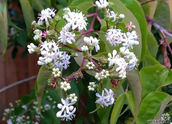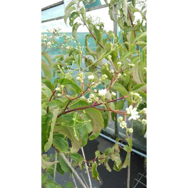 Heptacodium miconioides is een Chinese struik of kleine bladverliezende boom met een late zomerbloei. Tot de vorst bloeien ze rijkelijk met losse pluimen van geurende witte tot roze sterachtige bloempjes, die in de nazomer vlezig worden en kersenrood verkleuren. Het leerachtig blad krijgt rode tinten in de herfst en valt vrij laat af.
