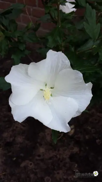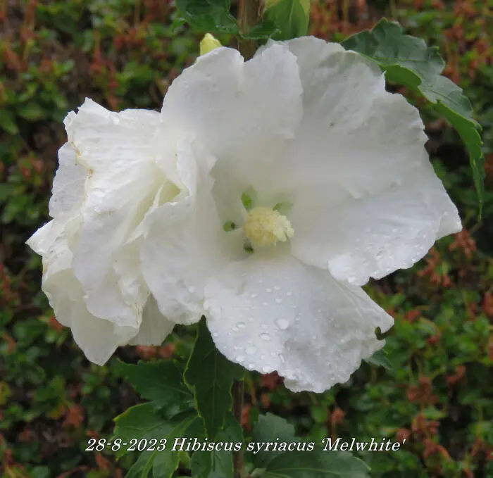 Hibiscus syriacus ‘Melwhite' is een rechtopstaande heester met een compacte groeiwijze en donkergroene bladeren die in het najaar geel verkleuren.