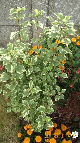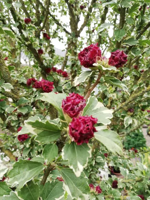 Hibiscus syriacus 'Purpureus Variegatus' is een rechtopstaande brede heester met een compacte groeiwijze en bonte bleekgele/groene bladeren.