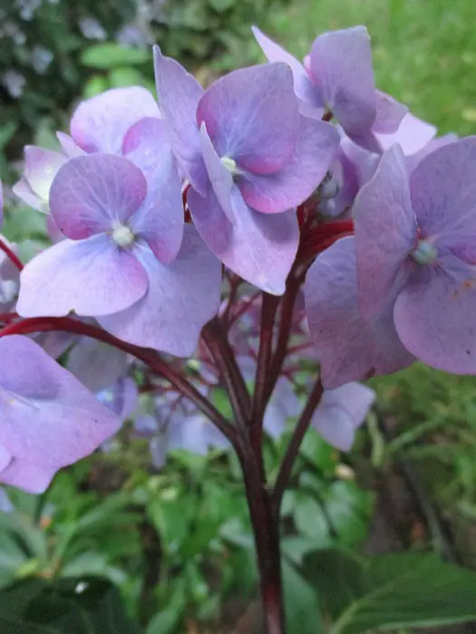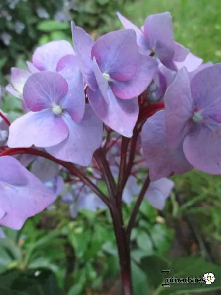 Hydrangea macrophylla 'Blue Ball' (serie Black Steel) bloeit met violetblauwe bloemtuilen maar het meest opvallende zijn de zwarte bloemstelen.
