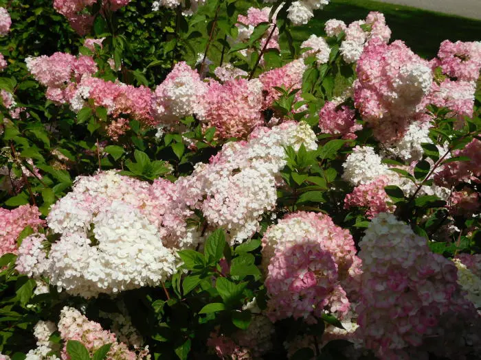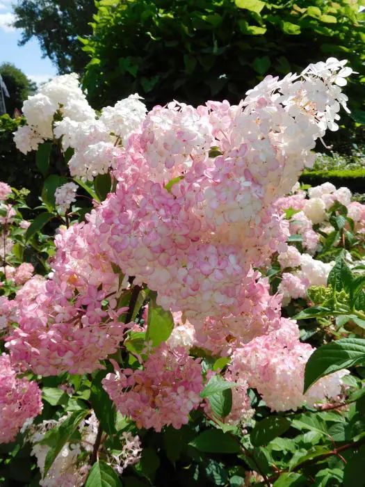 Hydrangea paniculata 'Vanille Fraise' bloeit met pluimvormige bloemen van roze tot wit verbloeiend naar aardbeienrood.