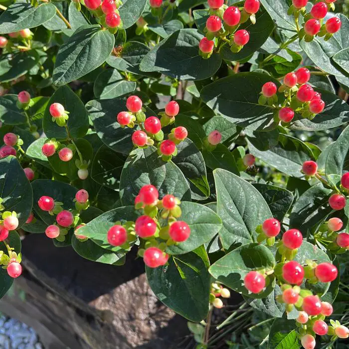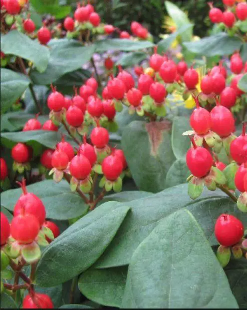 Bloeiend met felgele bloemen gevolgd door dieprode bessen.