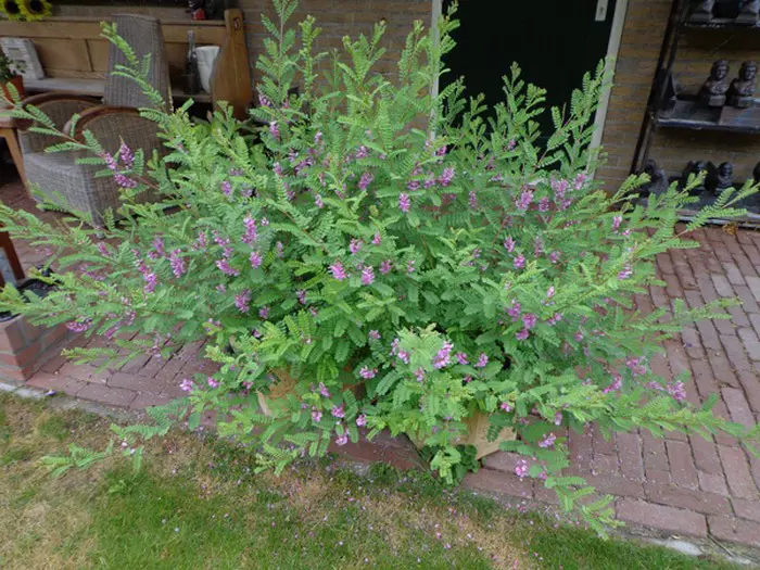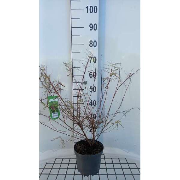 Een opgaande en breed uitgroeiende struik met mooie grijsgroene, gevederde bladeren.