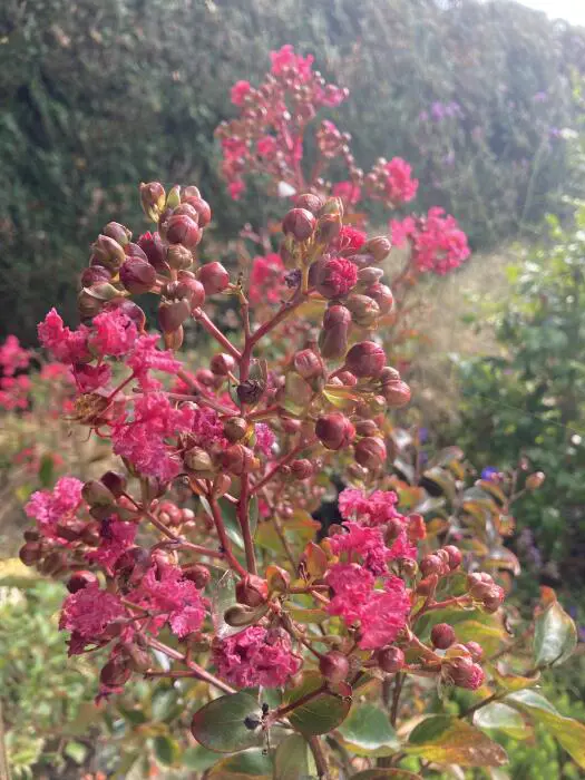 Lagerstroemia Indica 'Caroline' vormt een breed vaasvormige struik/lage boom.