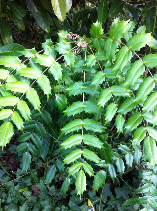 Mahonia bealei heeft geel/wit gevlekt blad.