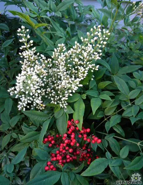 In de zomer krijgt de Hemelse bamboe pluimachtige witte bloemen gevolgd door decoratieve rode bessen in de winter. Het kan dat een Nandina geen bloemen en bessen krijgt. Er zijn namelijk soorten die verschil maken tussen mannelijke en vrouwelijke exemplaren. Je hebt er dan van beide een nodig.