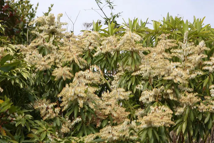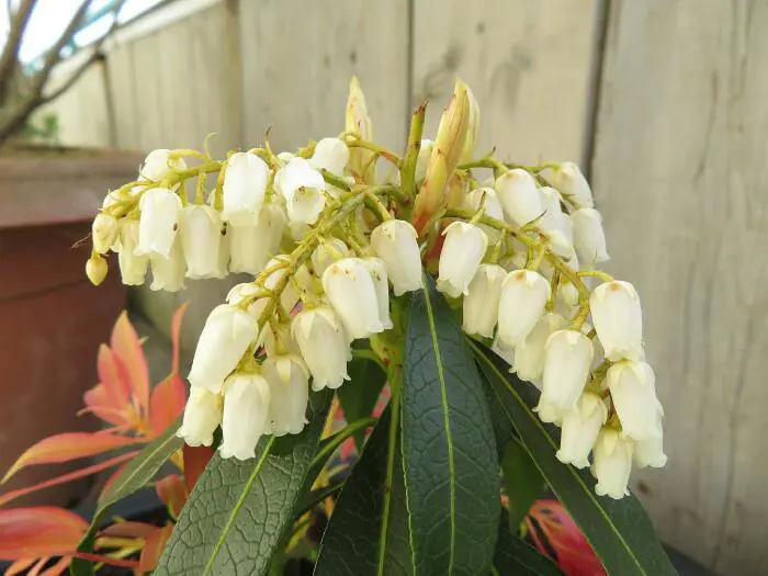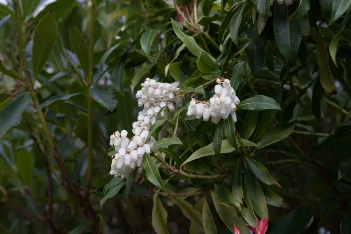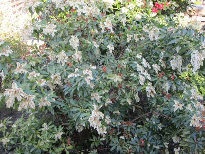 Bloeit rijkelijk met trossen van urnachtige witte bloemen.