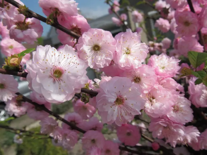 De grote gevulde bloempjes zijn helderroze en hebben een amandelgeur.