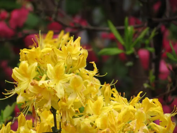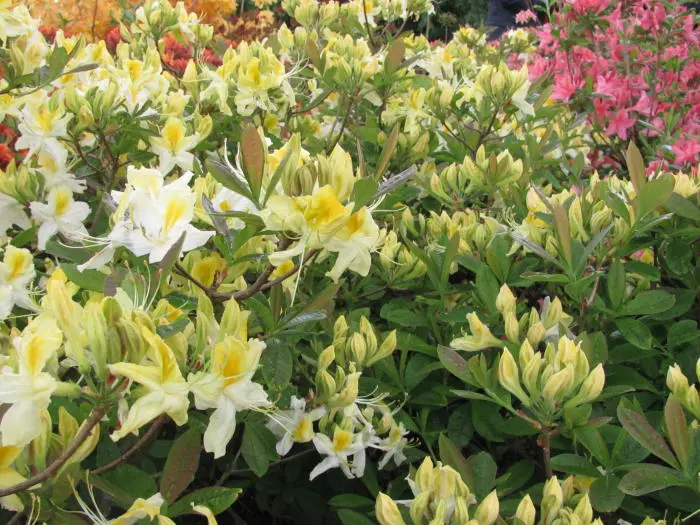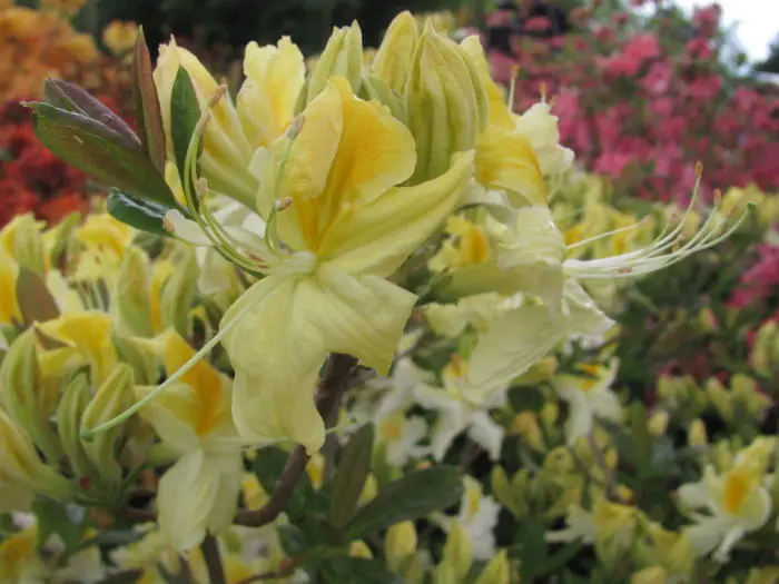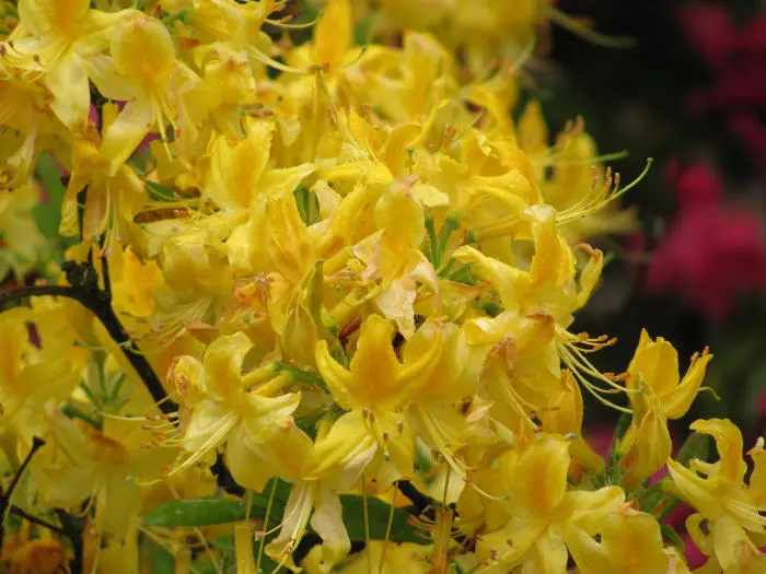 Rhododendron 'Anneke' vormt een struik met een opgaande groei. Heeft grote langwerpige bladeren en grote trossen van goudgele bloemen.