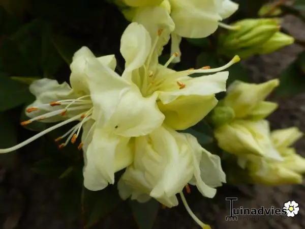 Rhododendron 'Curlew' is een laagblijvend struikje met rijkbloeiende ronde zachtgele bloemtrossen.