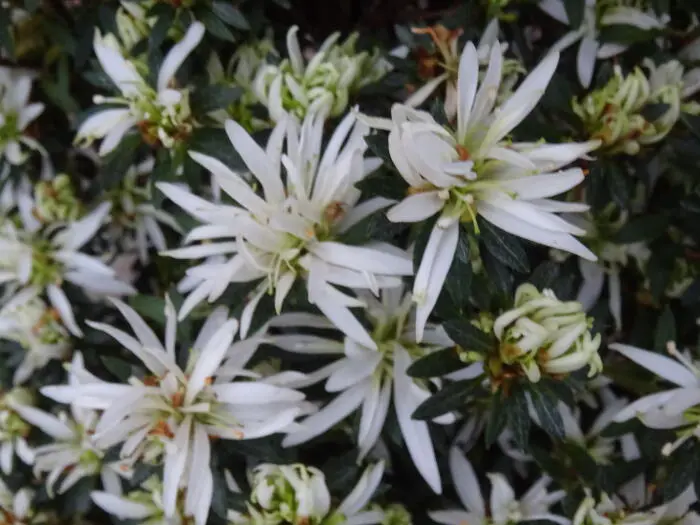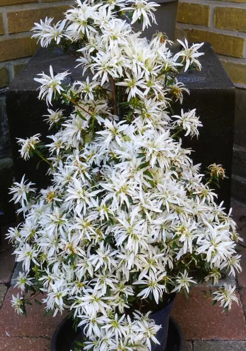 Rhododendron HORTINNO 'Evergreen' is een wintergroene, kleinbladige Japanse azalea met trossen van trechtervormige sterkere bloemen en donkergroene bladeren.