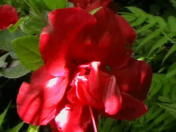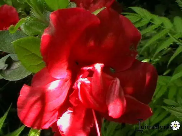 Azalea japonica 'Florida'is een bladhoudende soort met grote dieprode bloemen.