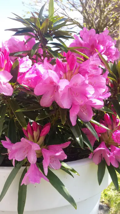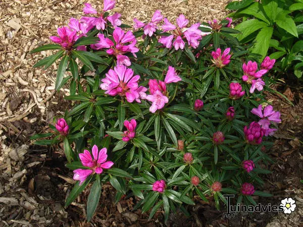 Een sterke lilaroze Rhododendron met erg mooie, smalle lancetvormige bladeren.