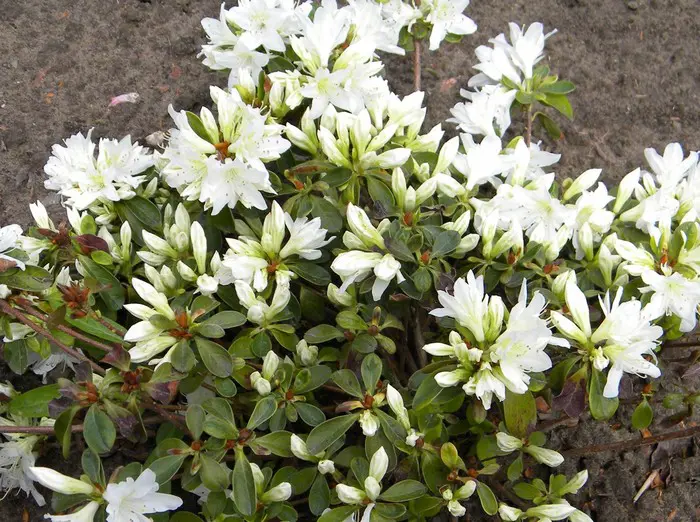 Rhododendron 'Fago No Fugi' bloeit met kleine witte bloemen.
