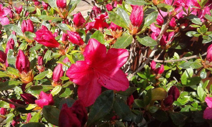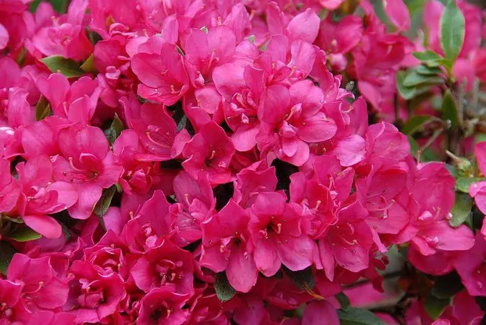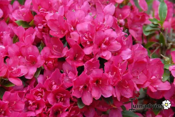Rhododendron x obtusum vormt een brede ronde struik en bloeit wit, roodpaars, roze, zalm en koraalroze, meerdere roodtinten, enkelvoudig of dubbelbloemig naar gelang de cultivar: