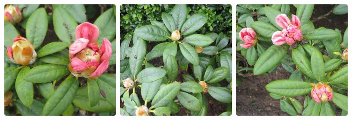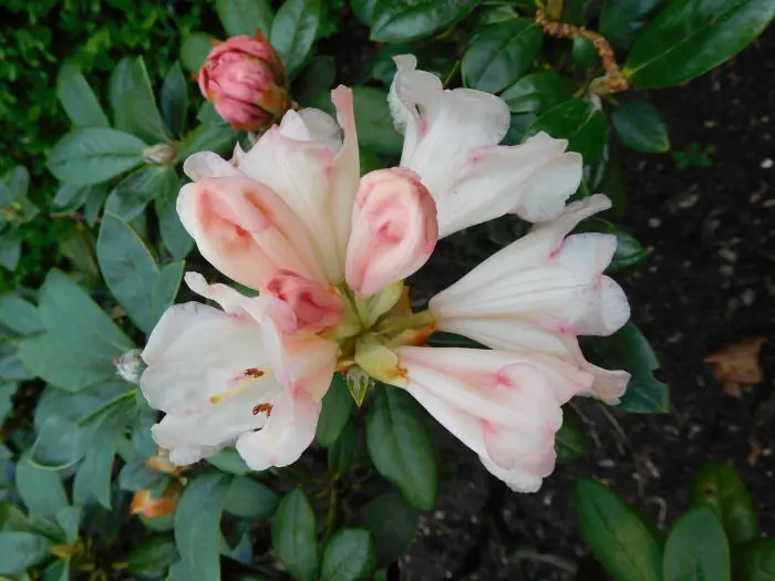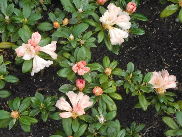 Laagblijvende Rhododendron met trompetachtige zalmroze tot geel verkleurende bloemen.