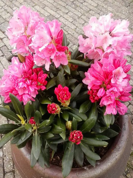 Rhododendron yakushimanum 'Kalinka' vormt een dichtvertakte compacte struik.De bloemen zijn helder rood aan de buitenkant , binnenin robijnroze verkleurend naar lichtroze, met geelgroene ogen.Snoeien kan na de bloei.