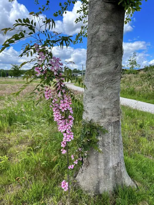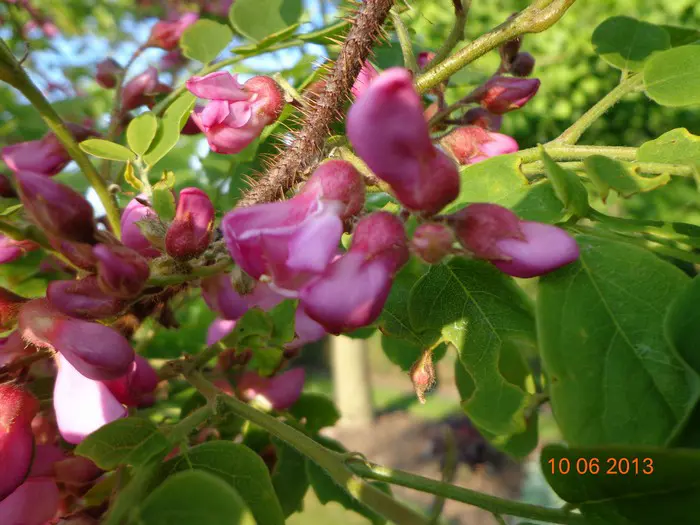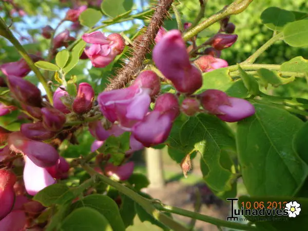 Robinia hispida bloeit roze.Plant hem beschut van koude en wind, op een warme plek.