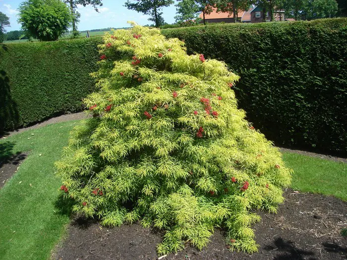 Sambucus racemosa heeft overhangende takken met lichtgroen gevederde bladeren.
