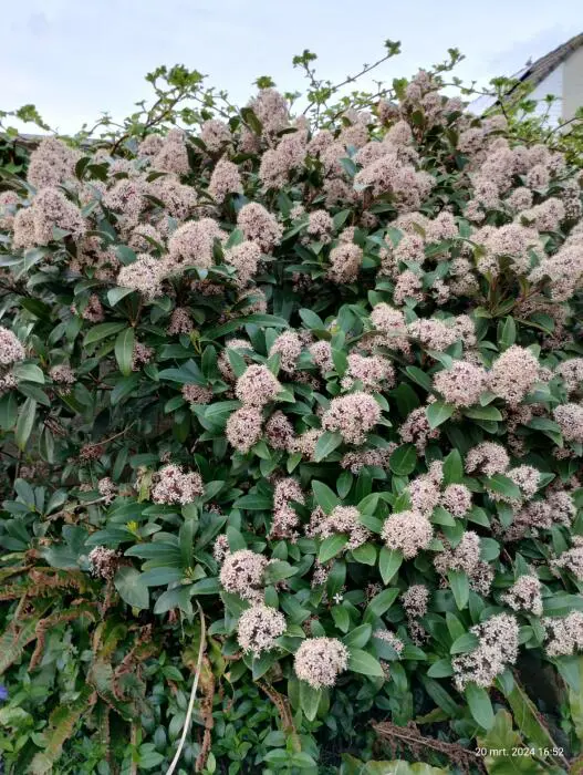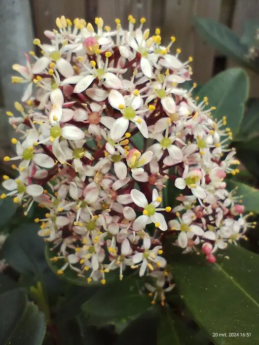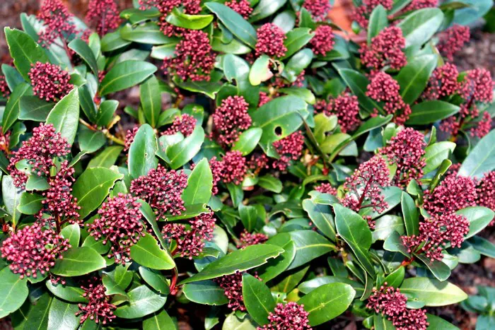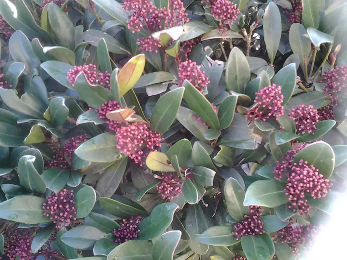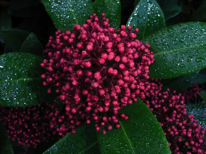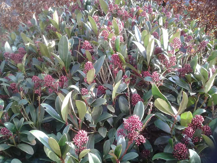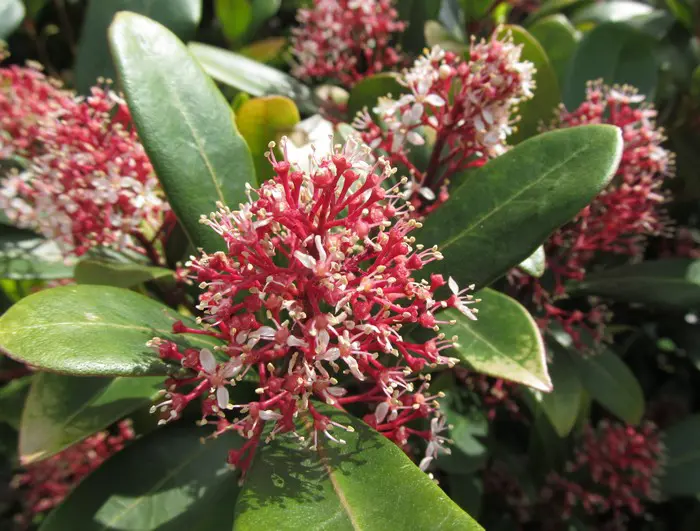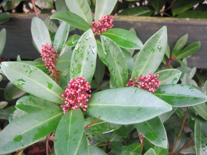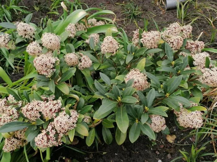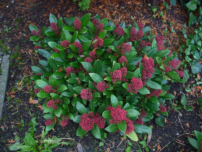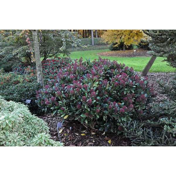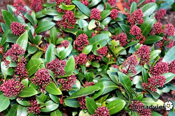 Skimmia japonica 'Rubella' is ook in de winter een decoratief groenblijvend plantje met een compacte, bolvormige groeiwijze, glanzend grijsgroene ovale blaadjes en vanaf oktober met witte naar rood verkleurende bloemknopjes. In de lente bloeien ze met zeer geurige roomwitte bloempjes.
