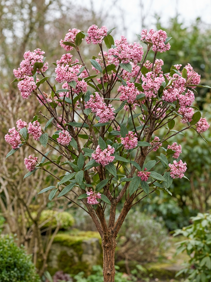Viburnum x bodnantense 'Dawn' is een bladverliezende bossige, rechtopgaande struik met trossen volroze bloemen aan kale takken in de winter, gevolgd door purperen bessen. Bloeit iets minder dan 'Charles Lamont' maar is wel meer roze van kleur.