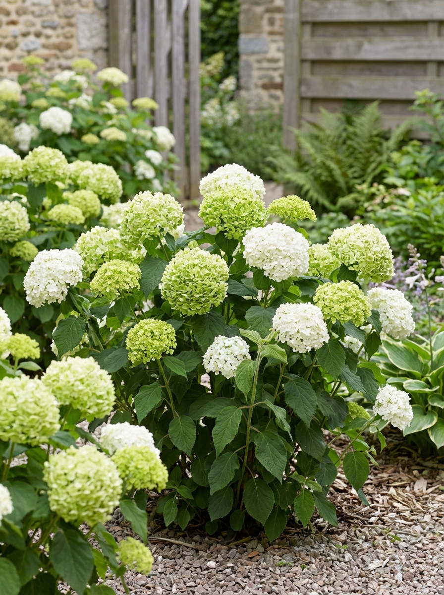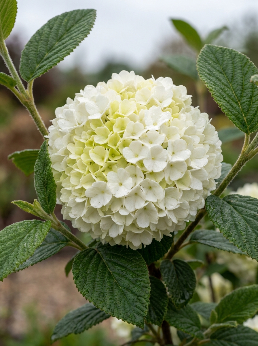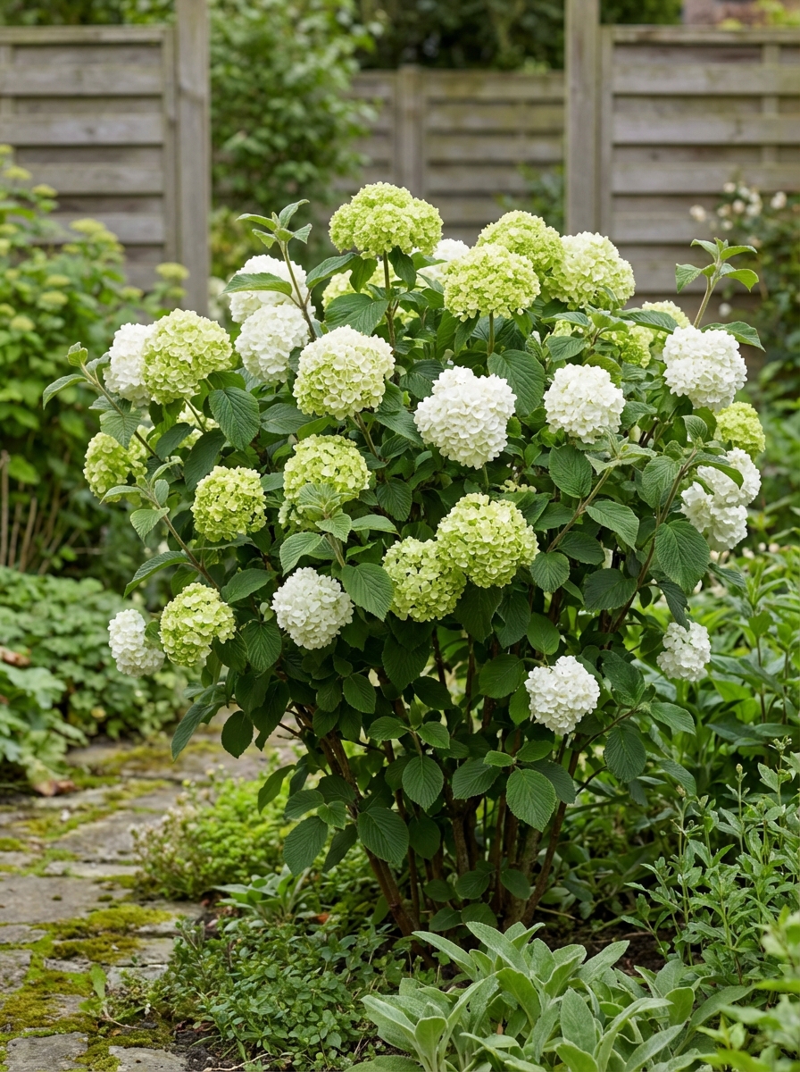 Bloeit met grote bolvormige trossen van steriele limegroene bloempjes die later volledig wit kleuren.