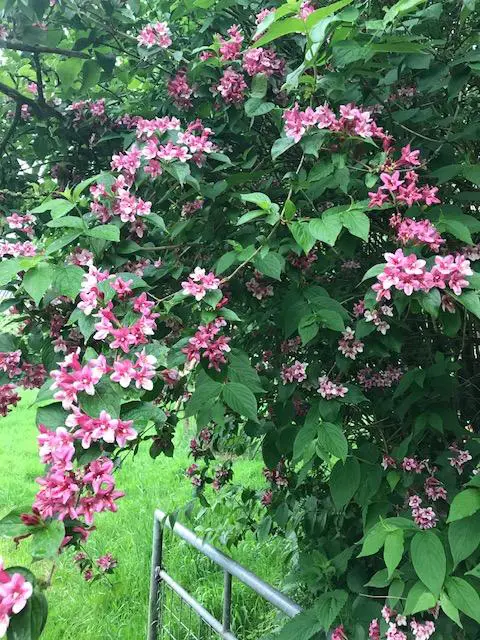 Weigela 'Bristol Ruby' is een rechtopgaande, steriele hybride met overhangende takken overladen met karmozijnrode bloemen.