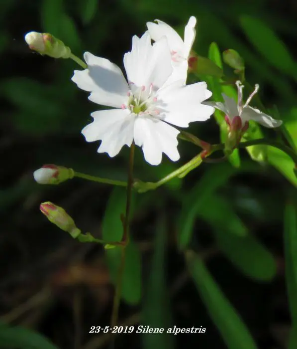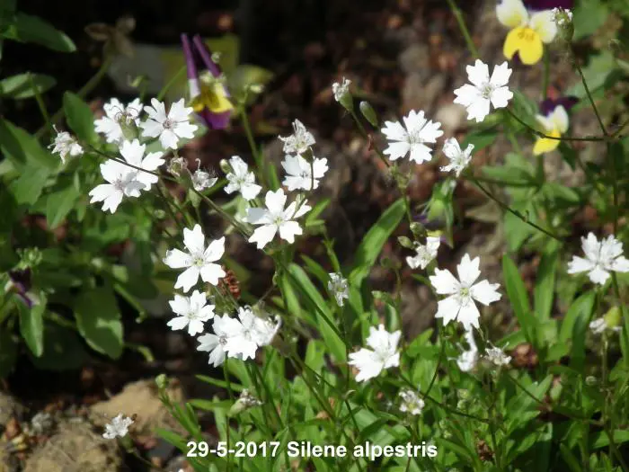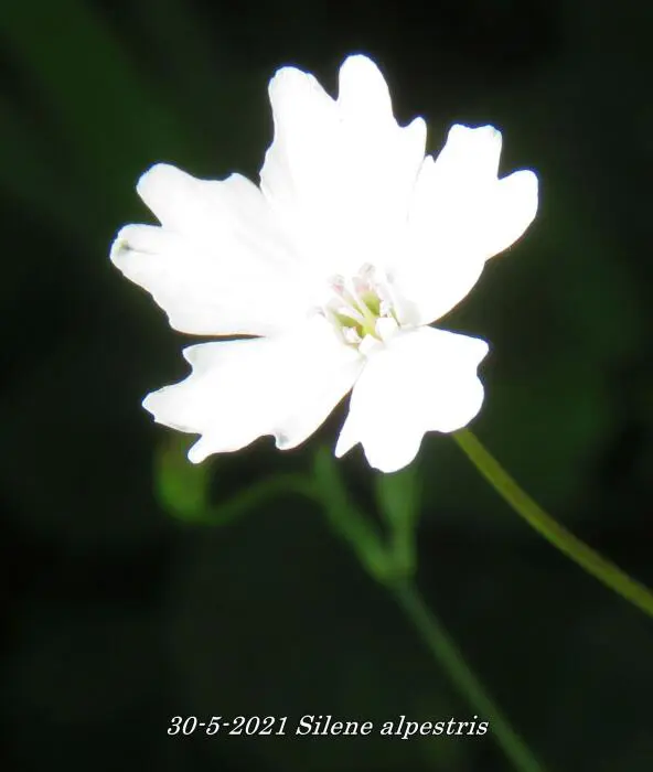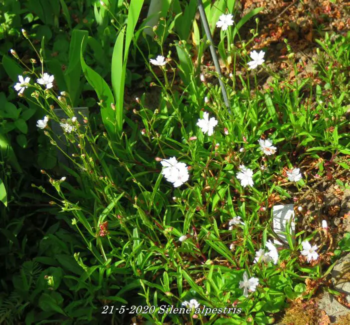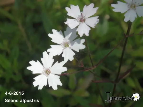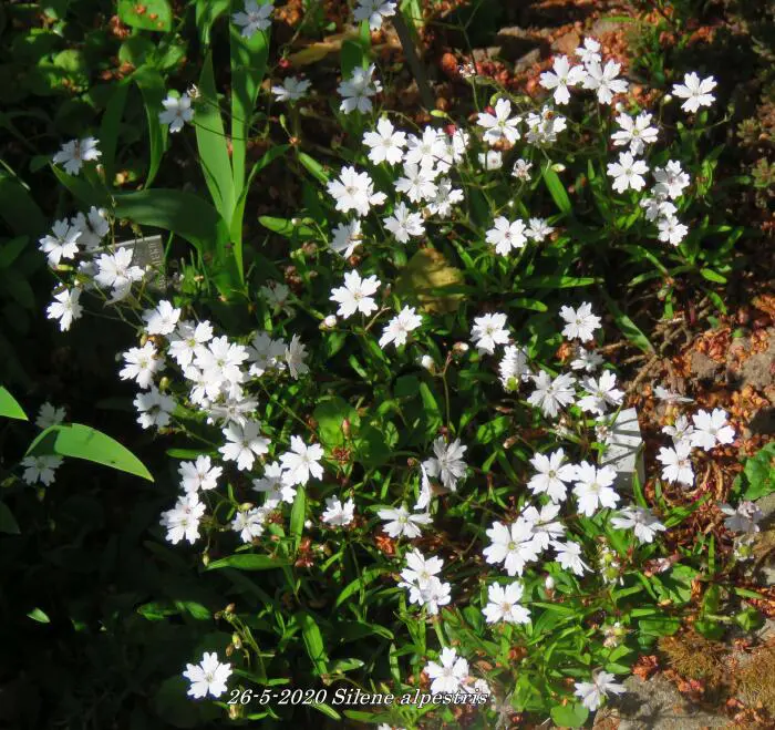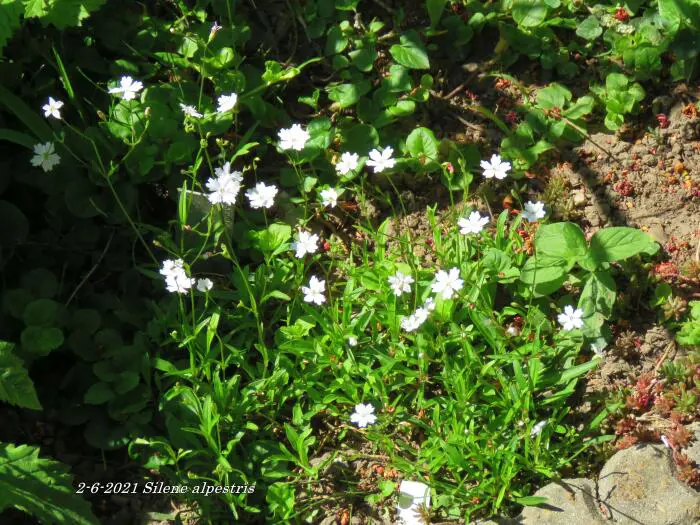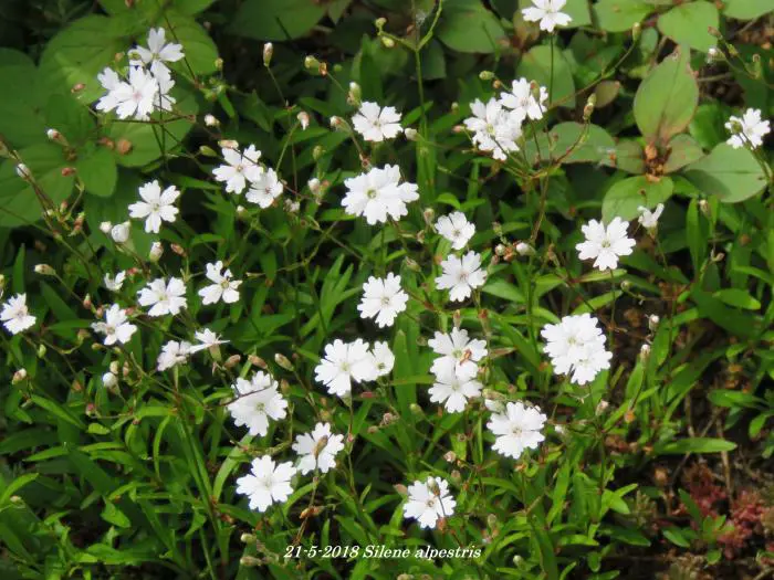 Silene alpestris inheems in het hooggebergte van Europa vormt een frisgroen compact plantje met witte bloempjes.