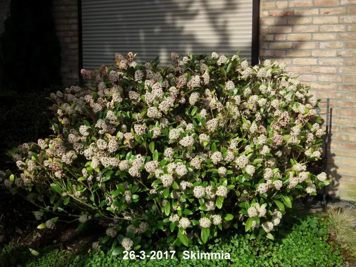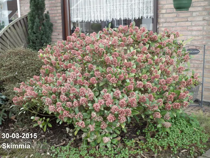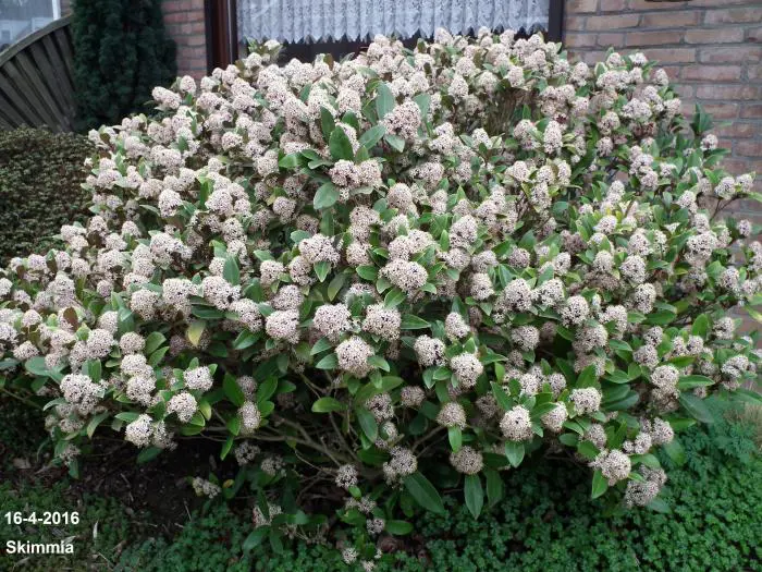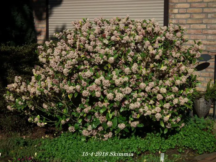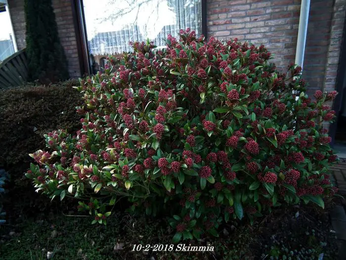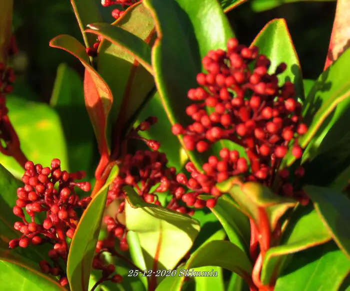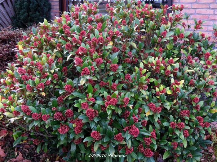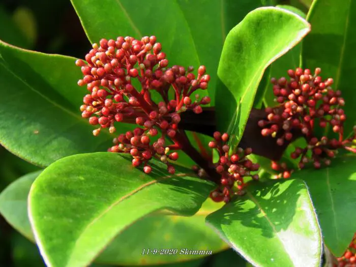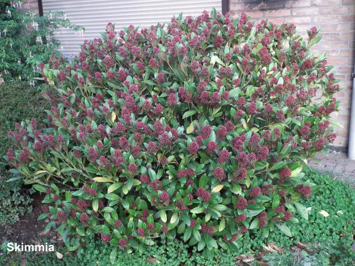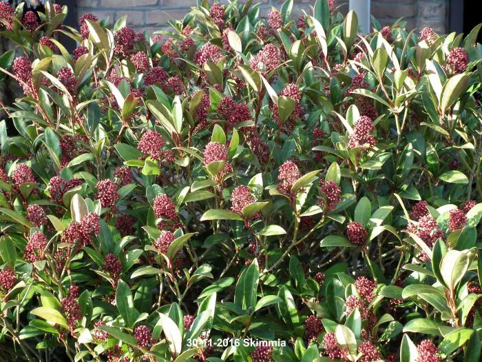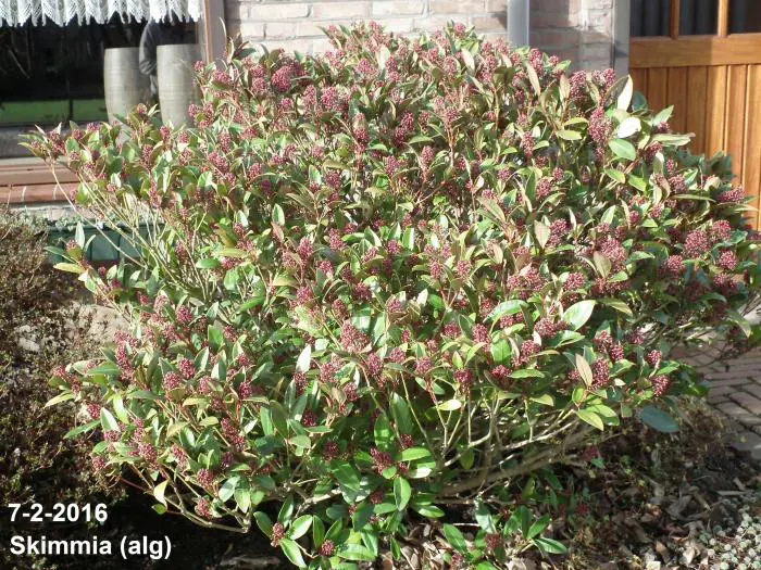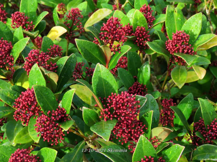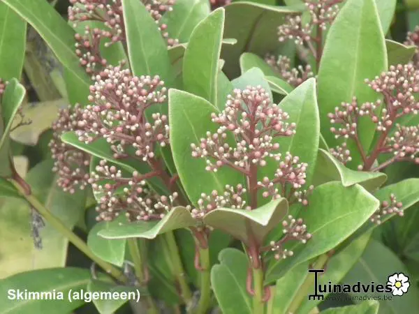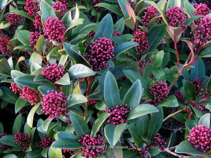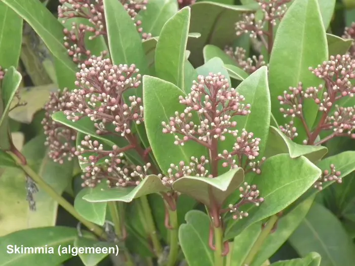 Skimmia is een bijzonder mooie plant, groenblijvend met glanzende leerachtige bladeren.