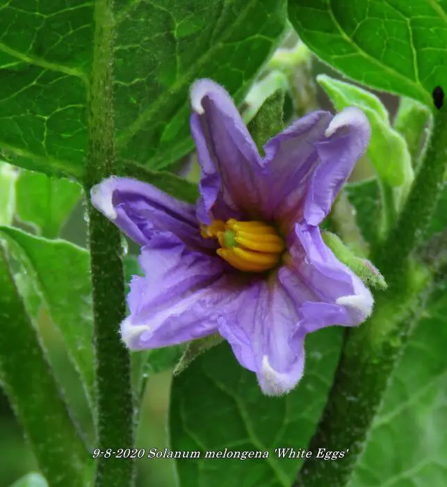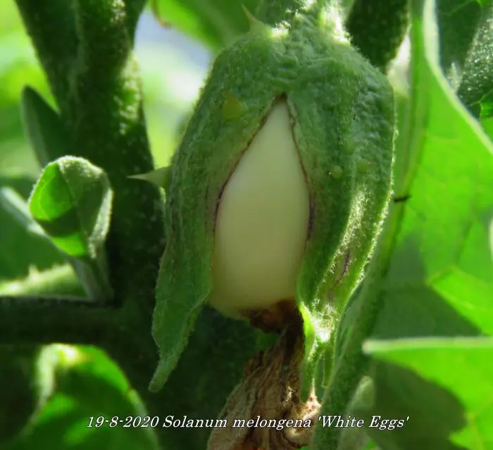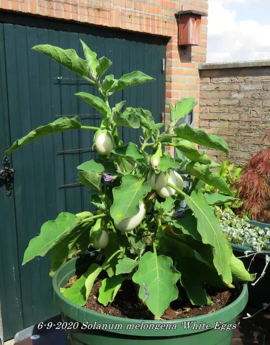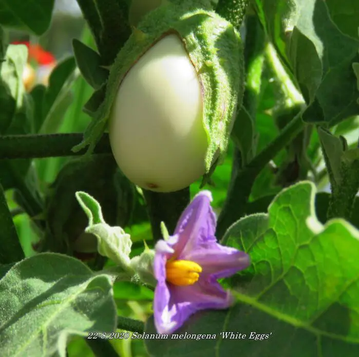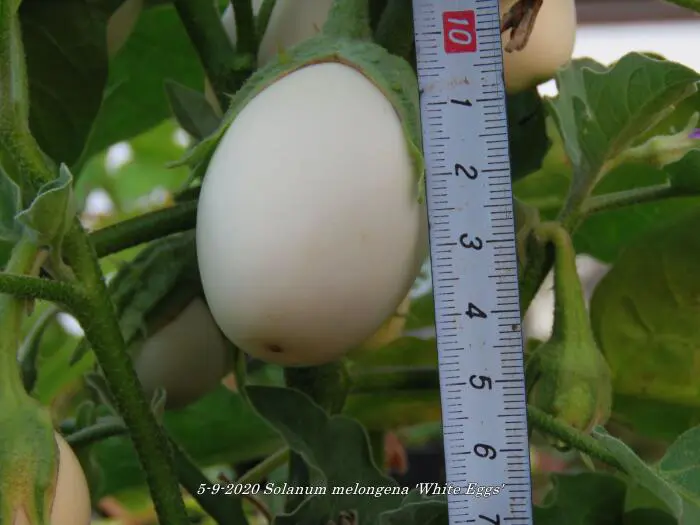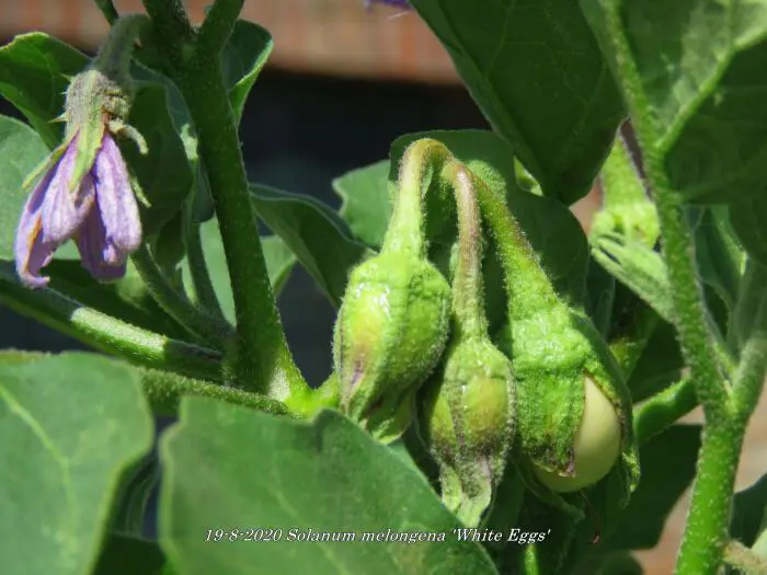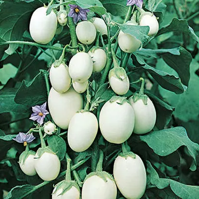Solanum melongena 'White Eggs' produceert kleine ronde helderwitte vruchtjes.
