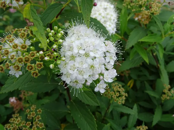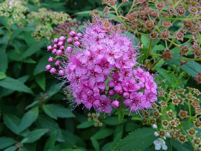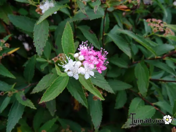 Spiraea japonica 'Genpei' is een stevige compacte struik met lancetvormige, licht -tot donkergroene bladeren met een warmoranje tint in de herfst.