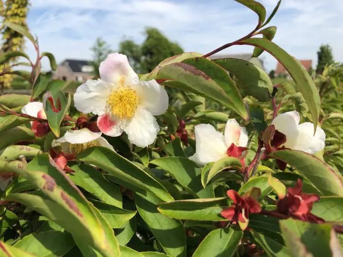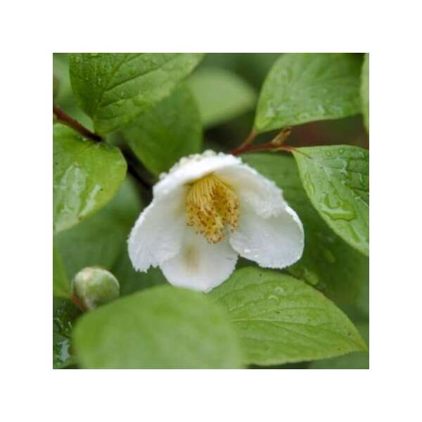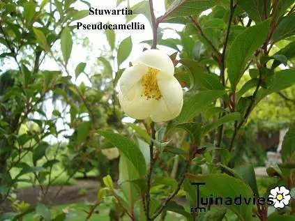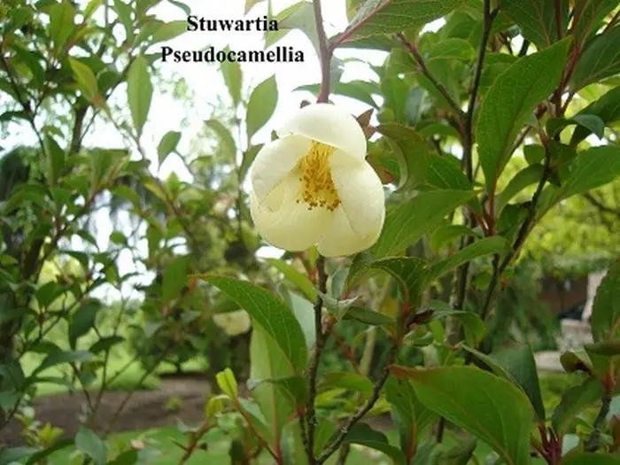 Stewartia pseudocamellia is een struikachtige boom en bloeit met op camelia lijkende witte bloemen.