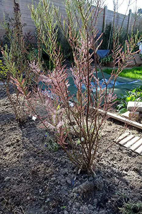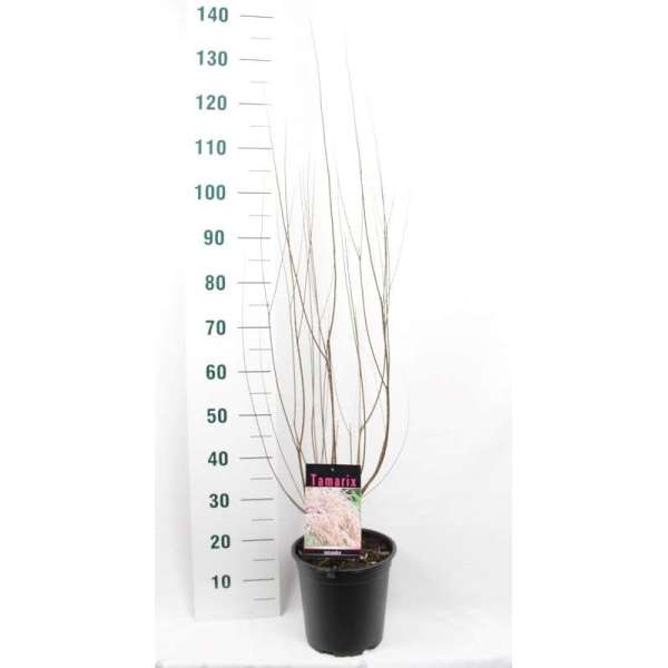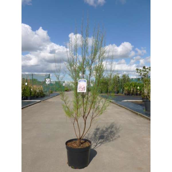 Het is een sierlijke struik/boom met overhangende (bijna) zwarte twijgen bloeiende met lichtroze pluimvormige bloemen.Jong schot is paars tot bruinachtig.
