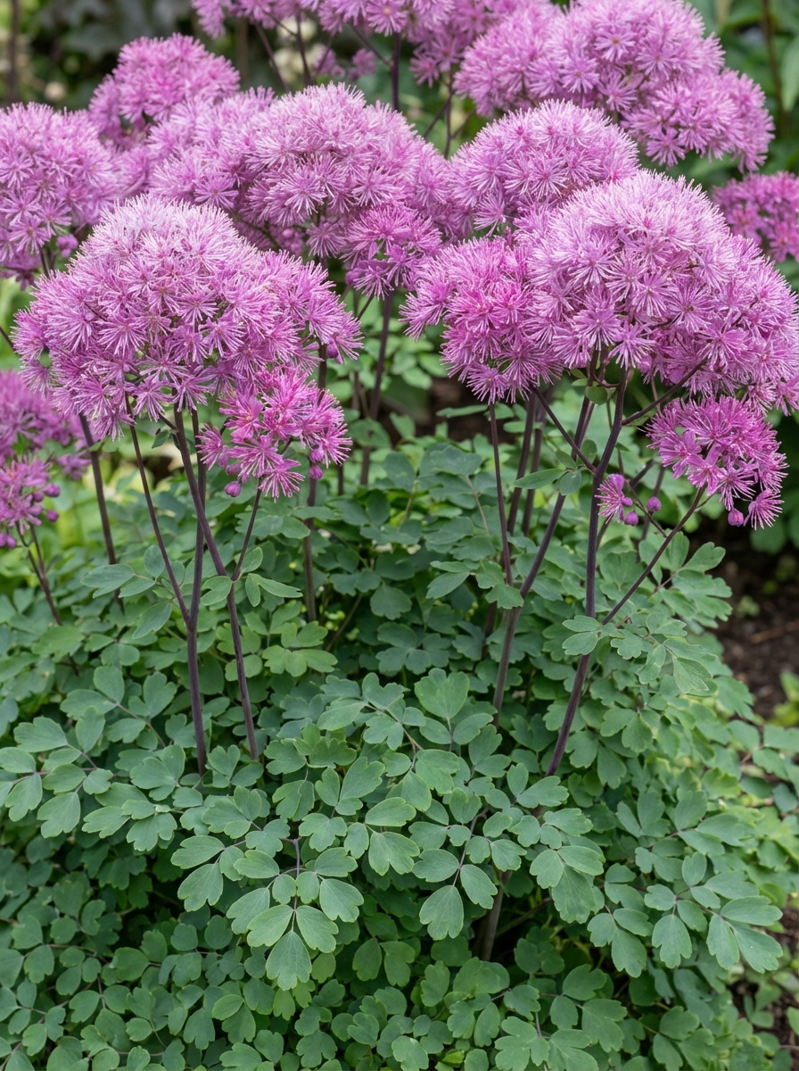 Thalictrum aquilegifolium 'Thundercloud' is een vaste plant vormt hoge rode stengels met grote bloeiwijzen bestaande uit kleine bloemen met lange en talrijke lilapaarse meeldraden, waardoor ze een aspect krijgen van warrige en pluizige pompons.