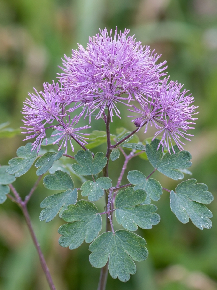 Thalictrum aquilegifolium is een vaste plant vormt hoge stengels met grote bloeiwijzen bestaande uit kleine bloemen met lange en talrijke lilaroze meeldraden, waardoor ze een aspect krijgen van warrige en pluizige pompons.