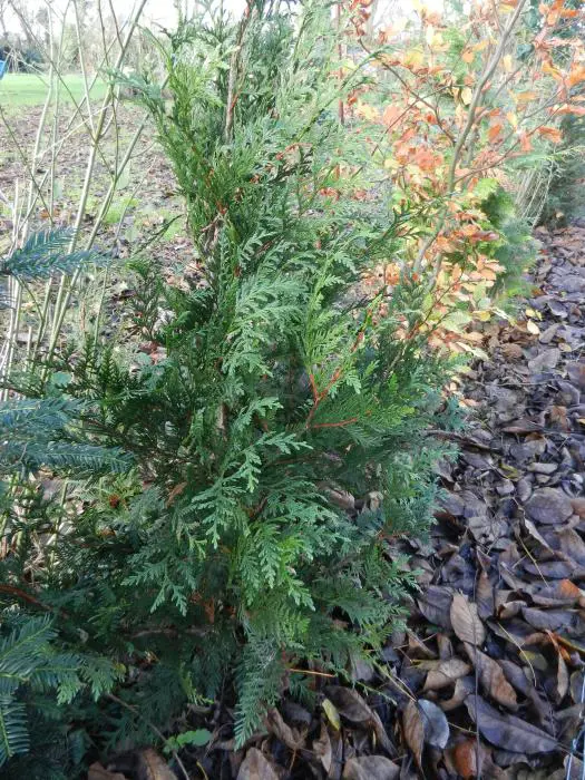 Thuja plicata 'Gelderland' is en compacte, smal kegelvormige conifeer met een fijne takkenstructuur.