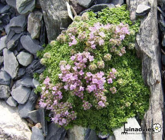 Tijm is niet alleen een veel gebruikt kruid in de keuken, maar sommige variëteiten lenen zich eveneens als goede bodembedekker (kruiptijm) voor een zandige, kalkhoudende grond.