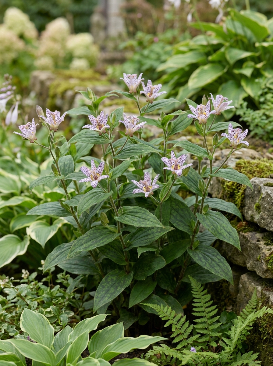 Deze Japanse vaste plant met een zeer exotische uitstraling is echter een sterke soort waarvan de bloemen op kleine lelies lijken. De bloemen zijn lilapaars met paarse vlekken, staan op soepele stengels met prachtige glanzend donkergroene bladeren