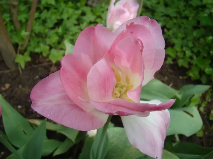 Tulipa 'Finola' is een dubbele pioenvormige tulp met wit/roze/groen gevlamde bloemblaadjes.