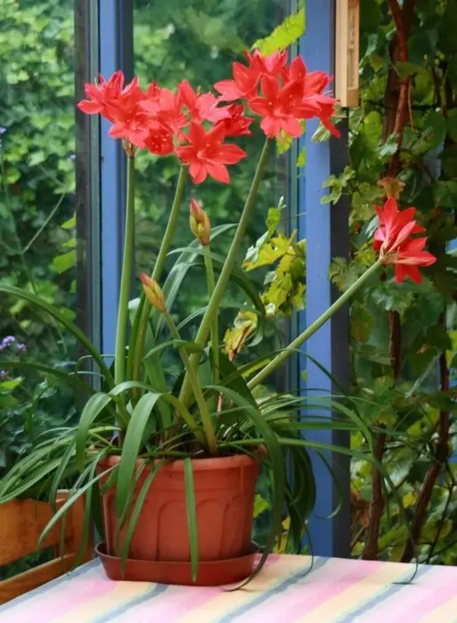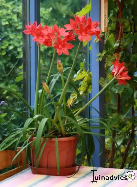 Vallota speciosa bloeit met grote felrode trompetvormige bloemen op een hoge kale stengel.