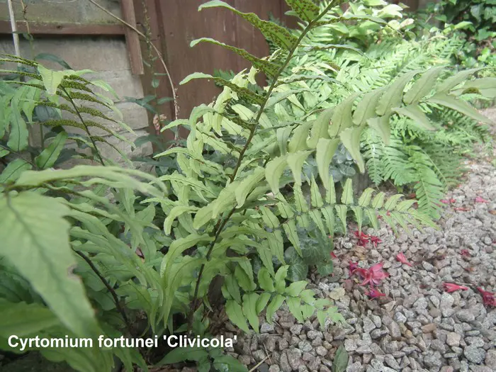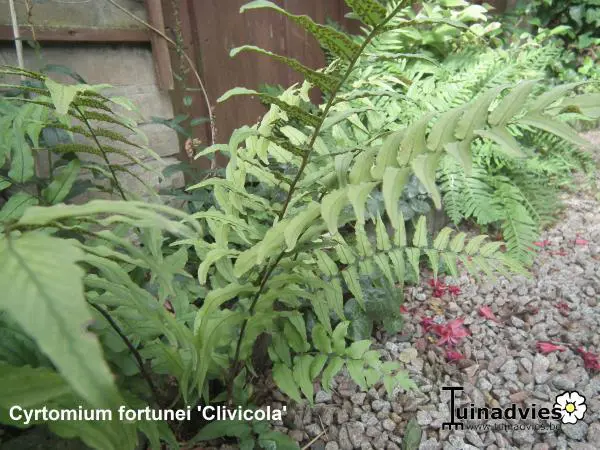 Cyrtomium fortunei var. Clivicola heeft glanzende groene enkel geveerde blaadjes die wat leerachtig aanvoelen.
