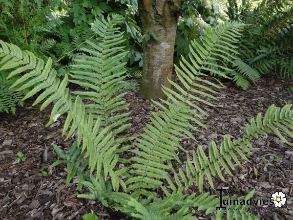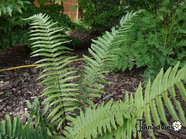 Dryopteris cycadina groeit met enkelgeveerde bladeren en dankt zijn naam aan het uitkrullend blad.