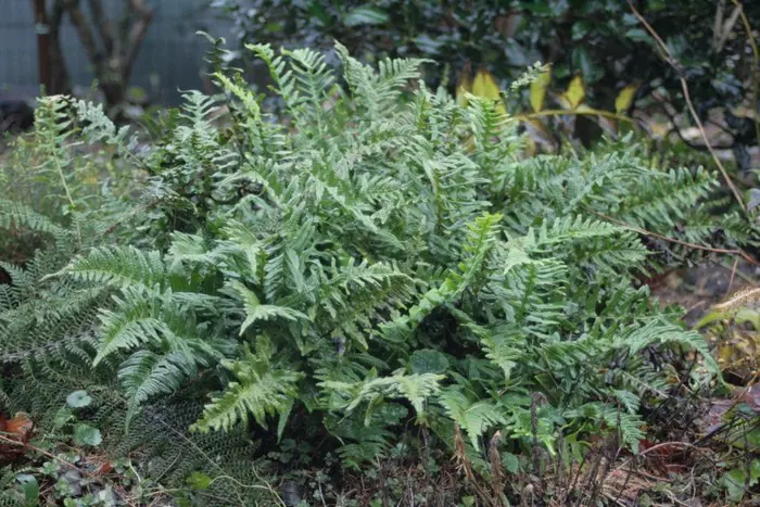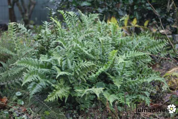 Een bodembedekkende varen dat met de tijd een dicht tapijt vormt van donkergroene leerachtige veren.