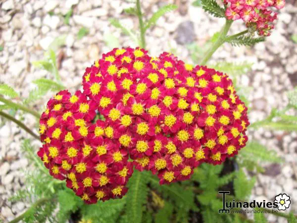Achillea millefolium 'DESERT EVE Red' is een compacte en zeer kleurrijke variëteit, met grote bloemschermen van steenrode bloemen met een klein goudgeel centrum.