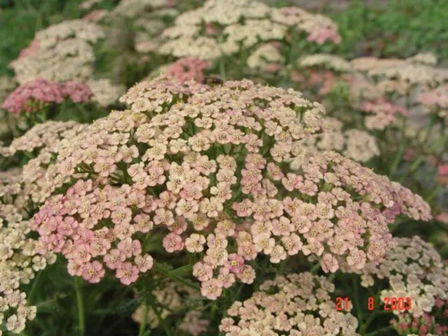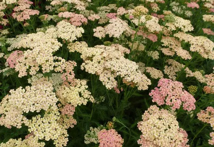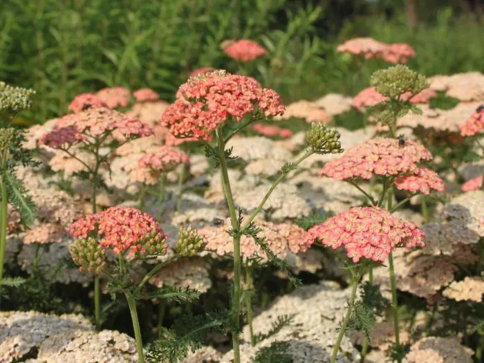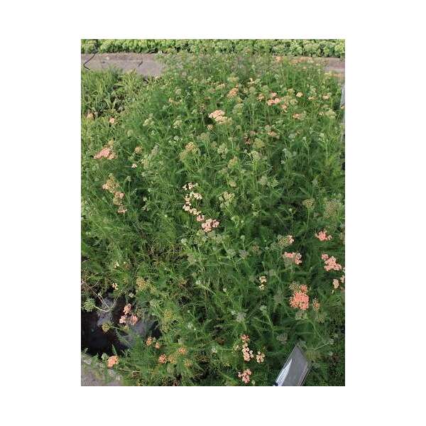 Het is een sterke groeier met prachtig grijsgroen geveerd, aromatisch blad en bloeit met afgeplatte schermvormige tuilen van koraalroze, zalm en romig geel.