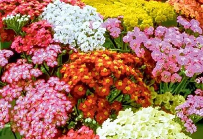 Achillea millefolium 'Summer Pastels' bloeit in een mengeling van roze, rode, oranje, zachtgeel en wit. Deze verkleuren dan nog eens naar mate ze verbloeien in verschillende tinten.