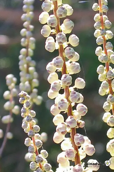 Wordt wel 150cm hoog, met groene gevederde bladeren en lange, witte aarvormige bloemen. Na de bloei verschijnen de bessen, die wel giftig zijn.