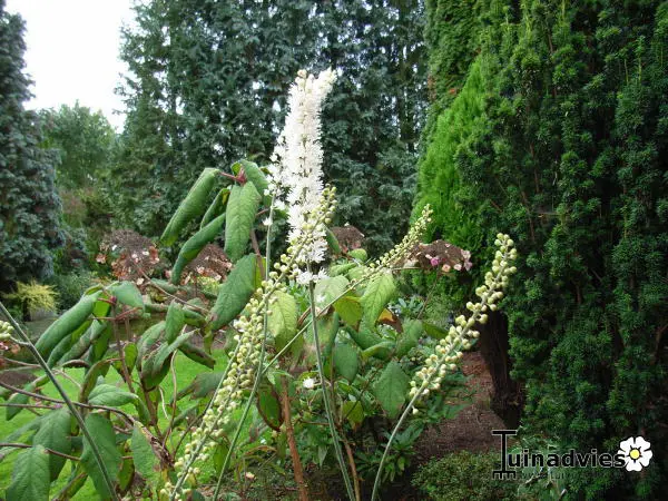 Actaea simplex 'White Pearl' heeft een mooi fijn ingesneden, heldergroen blad en lange gebogen stengels met witbloeiende dikke aren die heerlijk geuren.