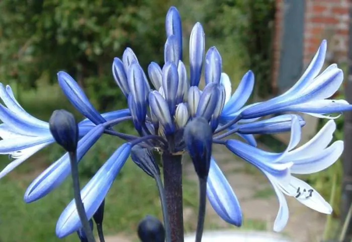 Agapanthus ‘African Queen’ bloeit met blauwe/witte bloemen op stevige donkere stengels.