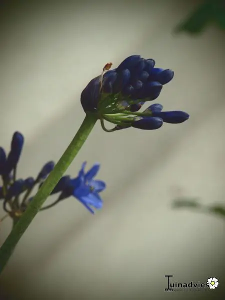 Agapanthus 'Windlebrook' heeft smalle riemvormige bladeren en bloeit rijkelijk met ronde schermen van donker violetblauwe trompetvormige bloemen op stevige stengels. Het is een verbeterde Agapanthus 'Lilliput', bloeit rijkelijker met iets grotere bloemen.